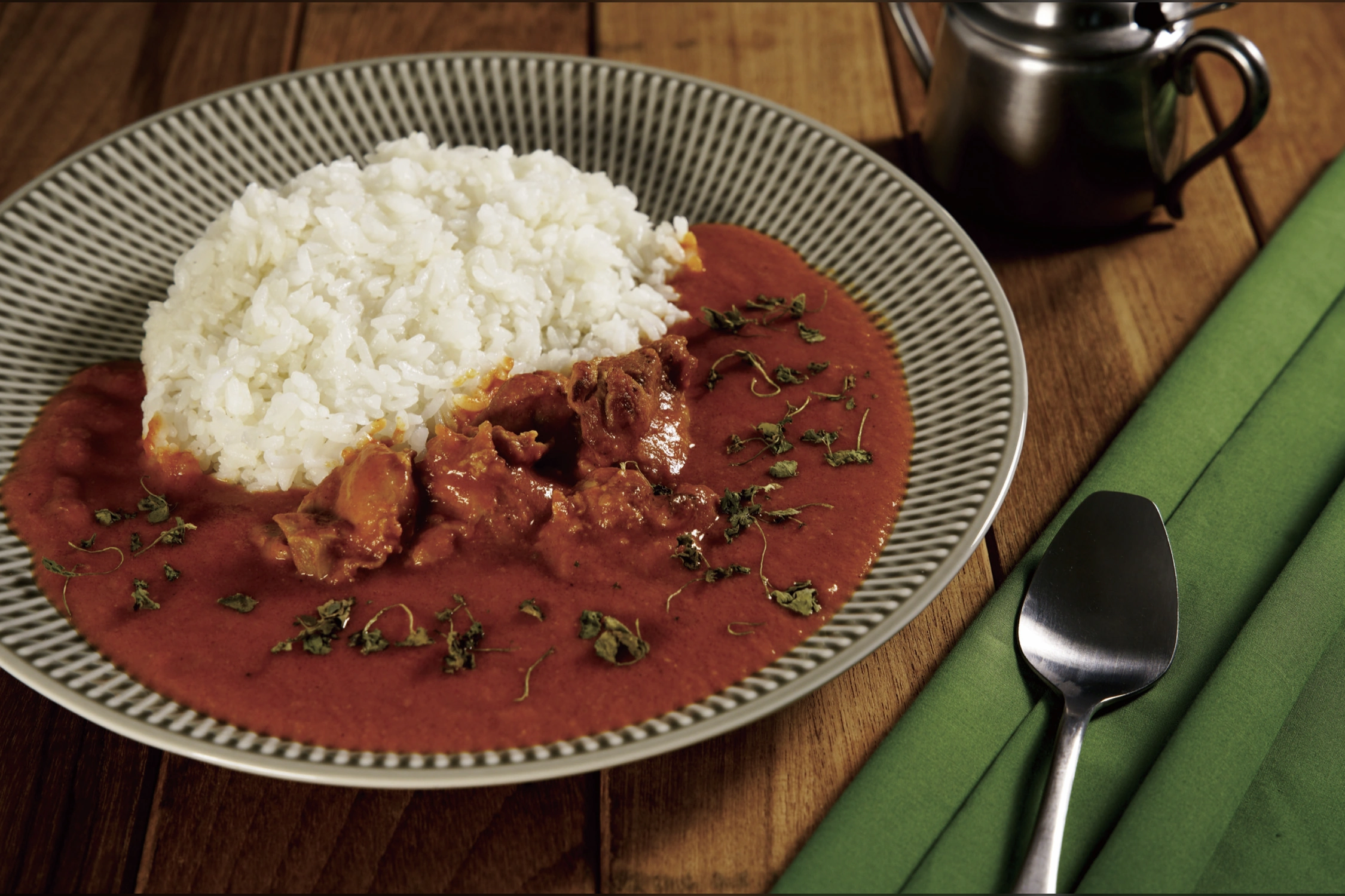 ちょっと大人のバターチキン 1,200 円 カレーの中でも人気の高いバターチキンを、ご飯に合うようチューニング!甘さ控えめでバターのコク、スパイスのキレを立たせ、少し大人の味わいに。大人気の看板商品です!