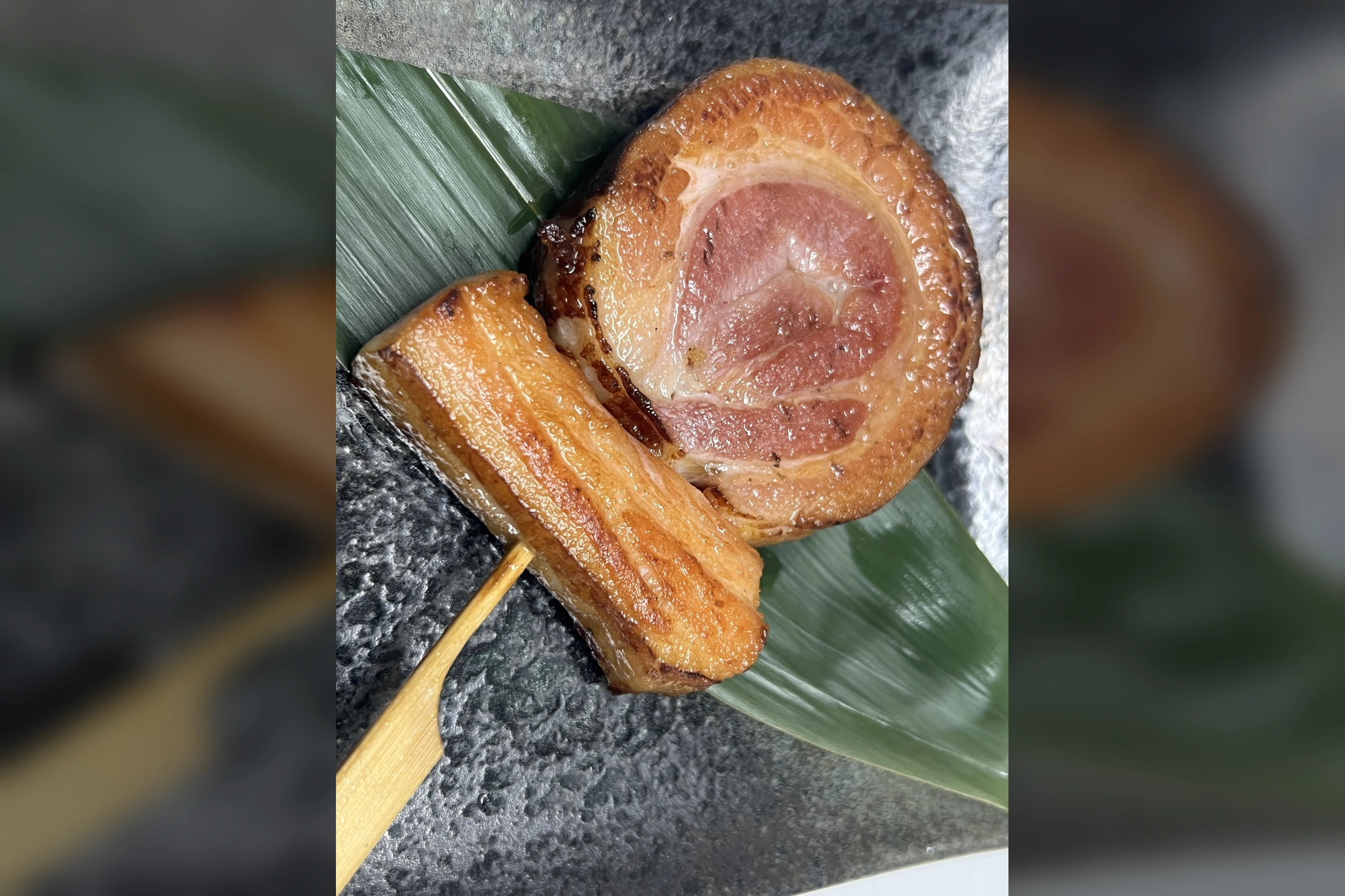 ハム焼® 600 円 各イベントやフェスで大人気の手造りハムの串焼き。ハムの概念を覆すジューシーな食感と芳醇な香りがやみつきになること間違いなし!原料は安心の国産豚肉100%です。五浦ハムの看板メニュー。